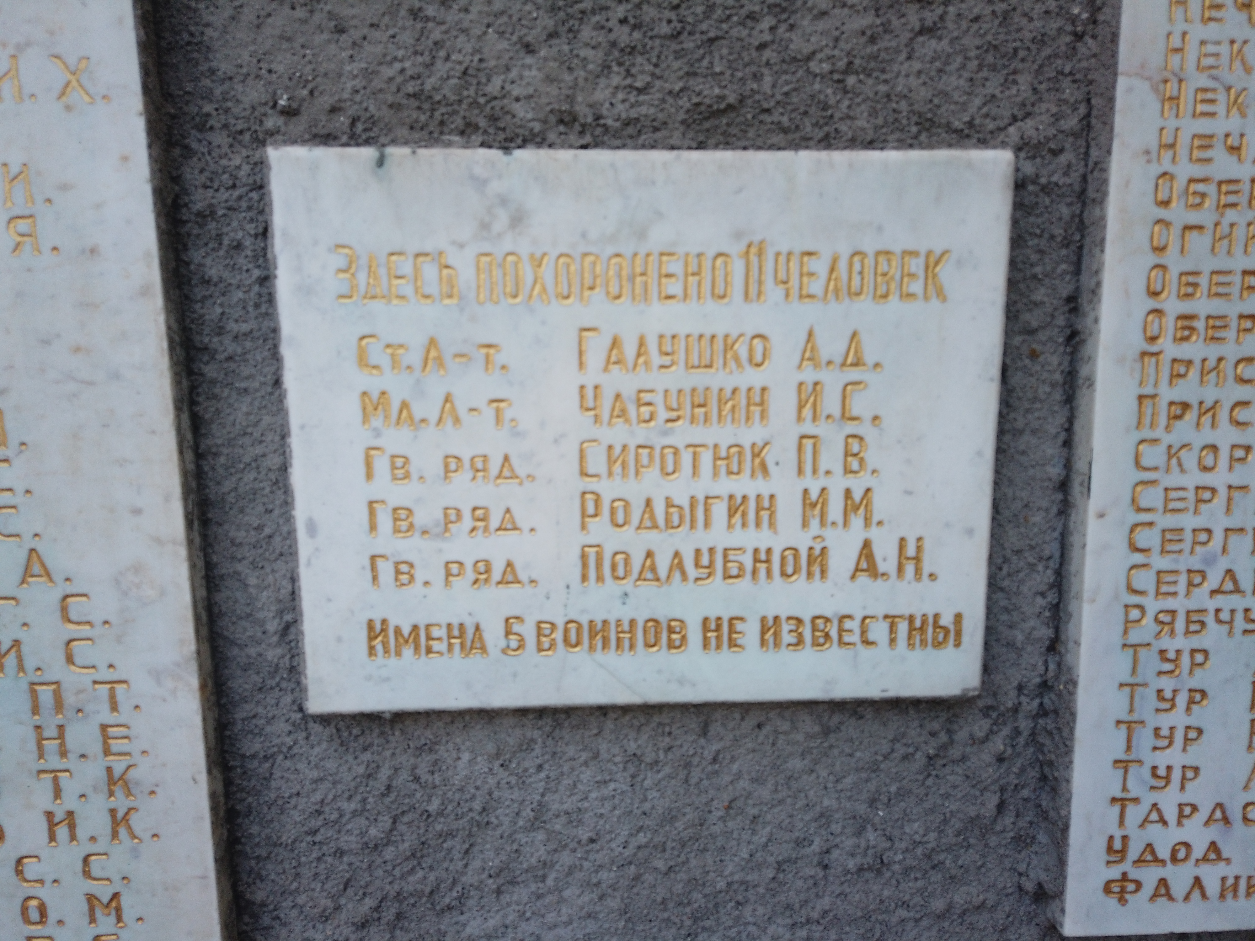 Почувши розмову в одному з дворів, я підійшла до хвіртки і запитала у господині, де знаходиться братська могила. Жінка радо відгукнулася, мені завжди щастить на добрих людей. Віра — директор клубу, єдиної незакритої комунальної сільської установи, провела мене до пам’ятника, дорогою розповідаючи про село, клуб та військове поховання. У могилі поховані 12 червоноармійців, один з них льотчик, старший лейтенант А. Д. Галушко, був збитий гітлерівцями над Миколаївкою в 1943 році і перепохований в 1950-х роках в братську могилу в Василівці. До меморіалу приїжджали родичі молодшого сержанта І. Г. Головка, уродженця Кіровоградської області, який загинув в жовтні 1941 року під час оборонних боїв на околиці Василівки. До війни Іван Григорович мав п’ятеро дітей і працював в Харцизькому районі Донецької області начальником шахти «Хартоп». На стелі встановлені дошки з іменами похованих і увічнені імена воїнів-односельчан.